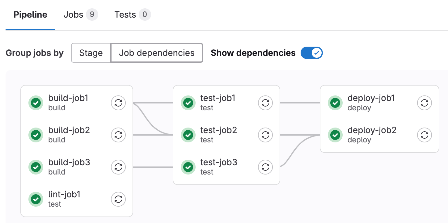When you configure jobs with the needs keyword, you have two options for how to group the jobs in the pipeline details page. To group the jobs by stage configuration, select stage in the Group jobs by section: